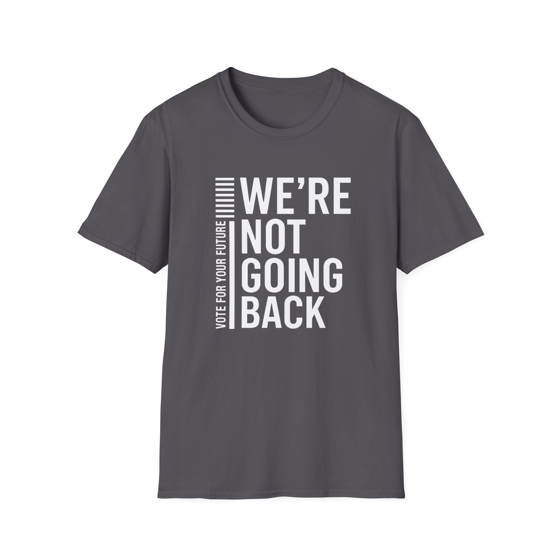 The future is in our hands, and this shirt is a dynamic reminder of the power we hold. Featuring the strong declaration "WE'RE NOT GOING BACK" alongside the crucial call to action "VOTE FOR YOUR FUTURE," this design directly links our collective momentum to the importance of civic engagement.